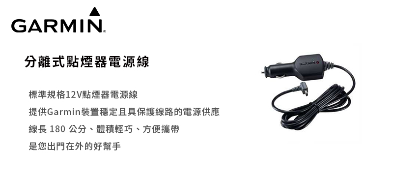 標準規格12V點煙器電源線,提供Garmin裝置穩定且具保護線路的電源供應
